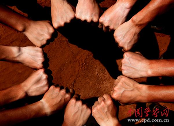 握紧拳头,围成同心圆,为了新营地加油!太阳底下,一双双手臂黑白分明,团结的拳头尽显力量之美。