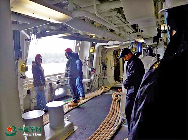 来自巴斯钢铁造船厂的工人在“朱姆沃尔特”号的一个系缆位上。为了隐身,舰上的所有系缆位都位于船体内部。