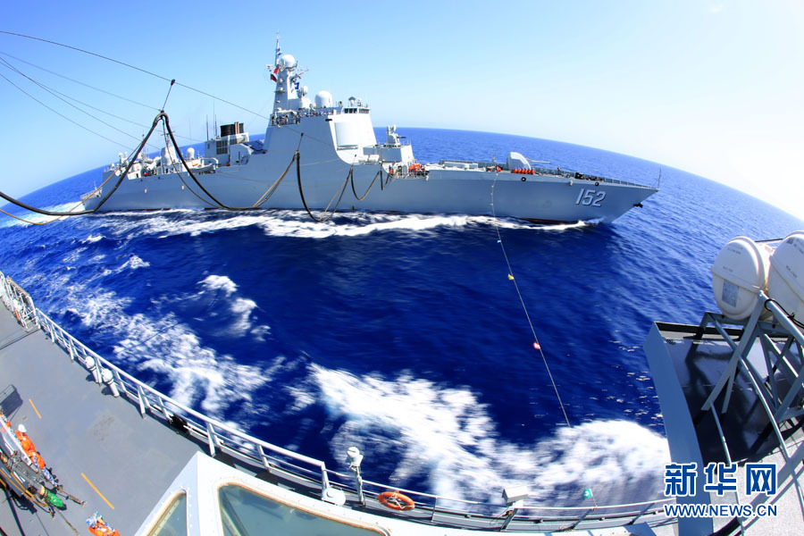 资料图片:2015年5月26日,东海舰队某驱逐舰支队济南舰补给训练现场。代宗锋 摄(图片由海军政治工作部宣传局提供)