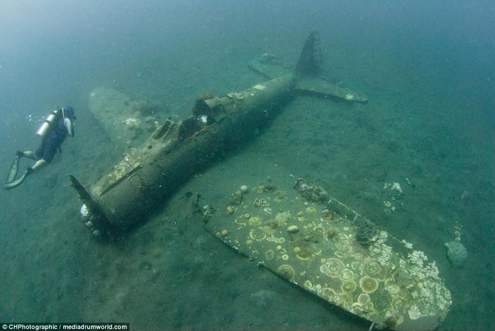 这些曾经参与世界大战的战斗机如今安静的躺在所罗门群岛大海185英尺(约56米)的浅层海床上。今夕形成了鲜明的对比,英勇的美国F6F地狱猫战斗机上覆盖了大量的珊瑚。