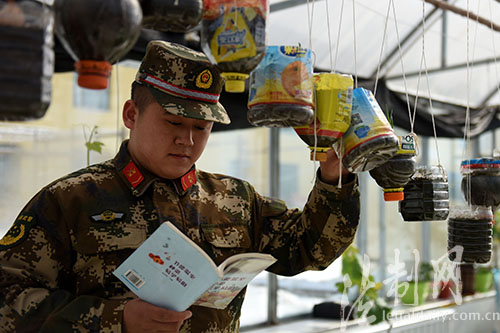 图为后勤班班长董野在温室大棚一边看书,一边研究如何在冻土地上长出新鲜蔬菜,他的梦想是让官兵在冬季里都能吃上新鲜蔬菜