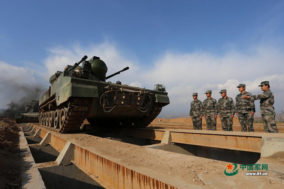 高炮驾驶员正在进行通过限制路与障碍物课目训练。