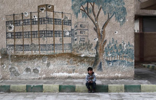 资料图:叙利亚大马士革郊区东古塔地区一个曾经的学校里,一个小男孩坐在布满弹痕的墙壁前。(法新社)