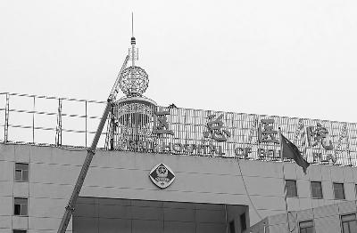 昨日,记者在北京军区总医院看到,工人正在拆除旧牌子 摄/记者 张颖川
