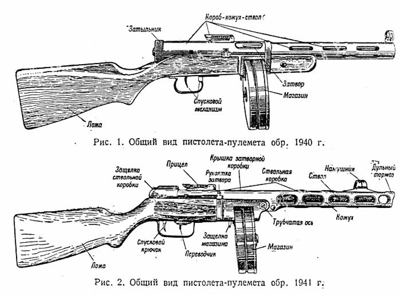 图为PPD-34冲锋枪(上)和PPSh-41(下)冲锋枪的细节对比,可见两者在枪口外形、散热口数量和扳机位置等方面均有不同,PPSh-41更为完善。