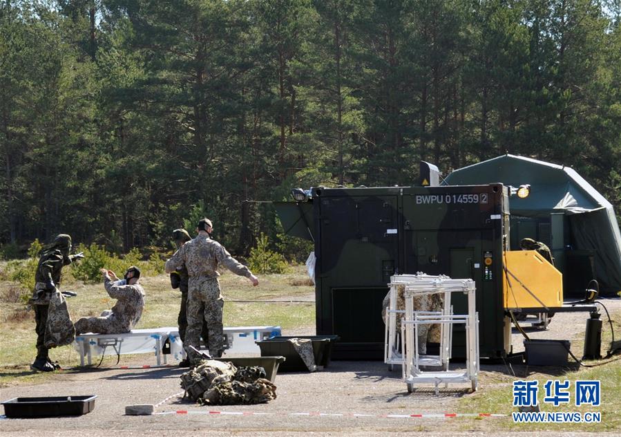 4月28日,在拉脱维亚阿达日军事基地训练场,德军防化兵对拉脱维亚士兵进行消毒。当天,代号为“夏季盾牌XIII”的多国大型军事演习在拉脱维亚阿达日军事基地进行了综合演练。“夏季盾牌XIII”多国军事演习4月17日至29日在阿达日军事基地举行。来自拉脱维亚、立陶宛、美国、加拿大、芬兰、德国等国的1300名士兵参加了此次演习。“夏季盾牌”演习始于2004年,自2014年被列入北约演习和训练计划。新华社记者郭群摄