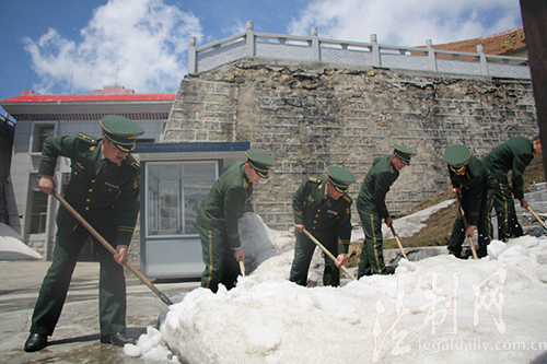 图为官兵正在清扫乃堆拉山口执勤点积雪