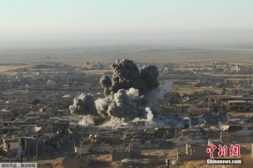 资料图:当地时间2015年11月12日,伊拉克北部重镇辛贾尔,库尔德自治区武装在以美国主导的“国际联盟”空中支援下,突破了“伊斯兰国”武装分子设在辛贾尔外围的防线。