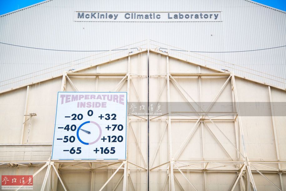 麦金利气候实验室,又名“440号建筑”,位于埃格林空军基地内,由美空军第96测试中队负责管理,其始建于1944年,于1947年投入使用,从这之后的几乎每种美军战机都会先在这里经过“冰与火”的考验后,才能进入部队服役 。图为实验室大门,门前的醒目标志展示了这个实验室能够模拟的温度范围(零下65至零上165华氏度,相当于零下53度至零上73摄氏度)。其还能模拟大风、浓雾、潮湿、降雨、冻雨、结冰云、积冰等复杂天气条件。