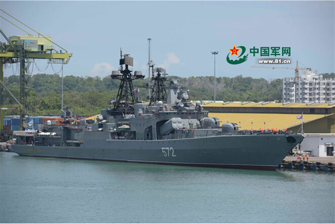 俄罗斯海军派出的“维诺格拉多夫海军上将”号大型反潜舰服役于俄罗斯海军太平洋舰队,属1155型无畏级大型反潜舰。本级舰是苏联海军于80年代末开始建造的专用大型反潜驱逐舰,武备主要有两座单装AK-100 100mm舰炮,2座4联SS-N-14反潜导弹发射装置,2座四联装533mm鱼雷发射管,2座RBU6000反潜火箭发射器,以及4座AK630近防系统,4座8联装SA-N-9近程舰空导弹。另外本级舰出于反潜需要拥有双机库,可携带两架卡25/27直升机。