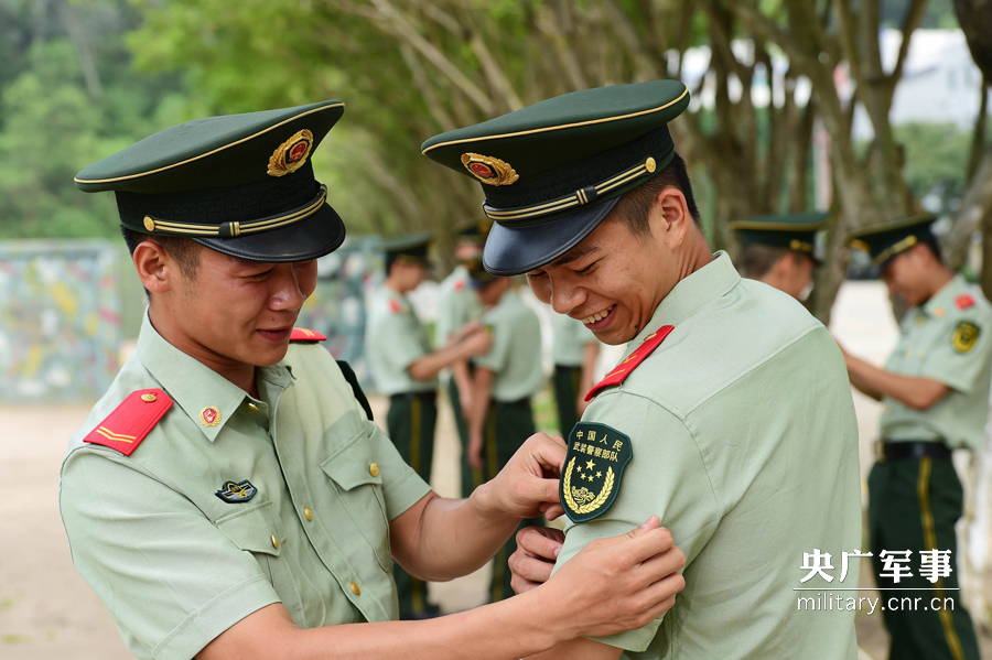 图为边防官兵换上新臂章喜笑颜开