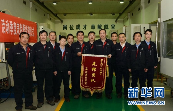 在位于河南洛阳的中航工业空空导弹研究院十一分厂,鲁宏勋(右五)带领的班组获得导弹院“型号建功先锋团队”锦旗(2013年4月18日摄)。新华社发