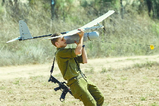 资料图:一名以色列士兵操作一架无人机起飞。