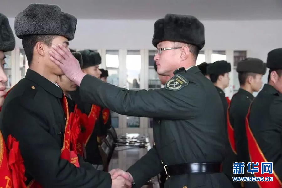 资料图片:杜宏送别连队即将退伍的老兵。(图片由内蒙古军区伊木河边防连提供)