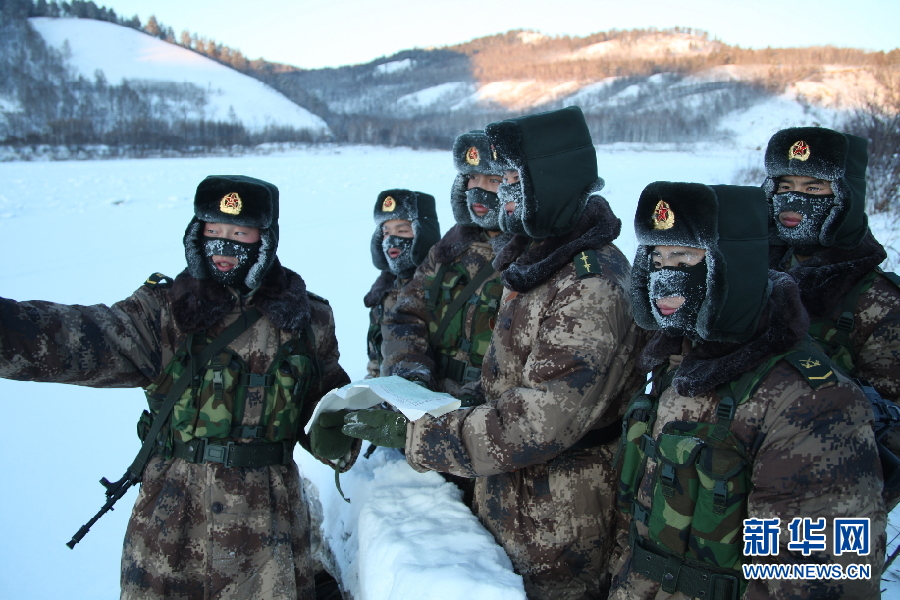 2010年1月25日,杜宏带领战友在界河冰道上巡逻、研判边情。(图片由内蒙古军区伊木河边防连提供)