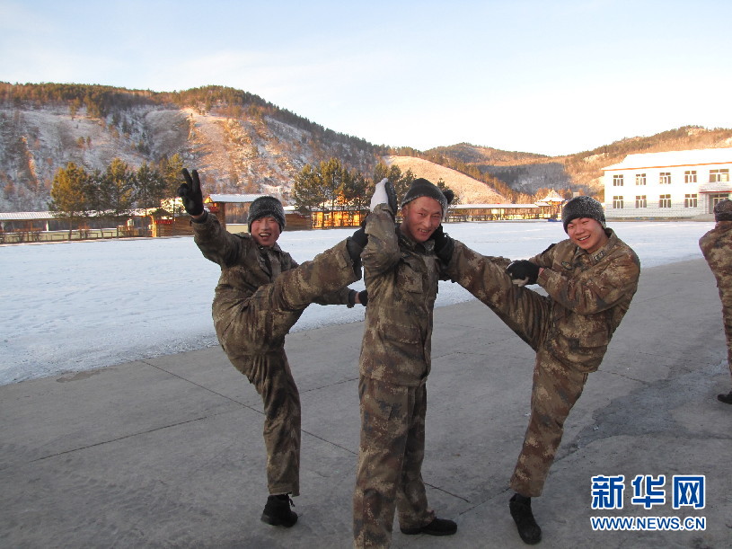 2011年12月12日,杜宏帮助战友在体能训练后压腿放松。(图片由内蒙古军区伊木河边防连提供)