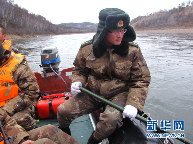 2012年10月14日,杜宏与战友乘坐冲锋舟巡护界河。(图片由内蒙古军区伊木河边防连提供)