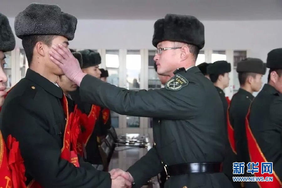 杜宏送别连队即将退伍的老兵。(图片由内蒙古军区伊木河边防连提供)