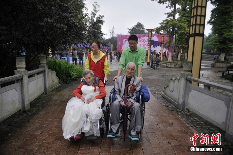 5月8日,重庆一所养老院举办“新婚金婚共浪漫”集体婚礼。70年婚龄的曹越华夫妇到场为新人祝福,牵出一段70年前一封战地情书的浪漫爱情故事。伴随着婚礼进行曲,20余对夫妇手挽手走上庆典舞台,金婚夫妇为新婚夫妇颁发结婚证书,祝福他们能够长长久久。庆典中,98岁高龄的曹越华老人牵着妻子王德懿的手,认真诵读着婚礼卡片上的誓词。