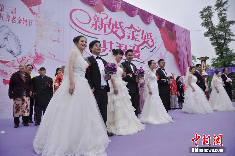 5月8日,重庆一所养老院举办“新婚金婚共浪漫”集体婚礼。70年婚龄的曹越华夫妇到场为新人祝福,牵出一段70年前一封战地情书的浪漫爱情故事。伴随着婚礼进行曲,20余对夫妇手挽手走上庆典舞台,金婚夫妇为新婚夫妇颁发结婚证书,祝福他们能够长长久久。庆典中,98岁高龄的曹越华老人牵着妻子王德懿的手,认真诵读着婚礼卡片上的誓词。
