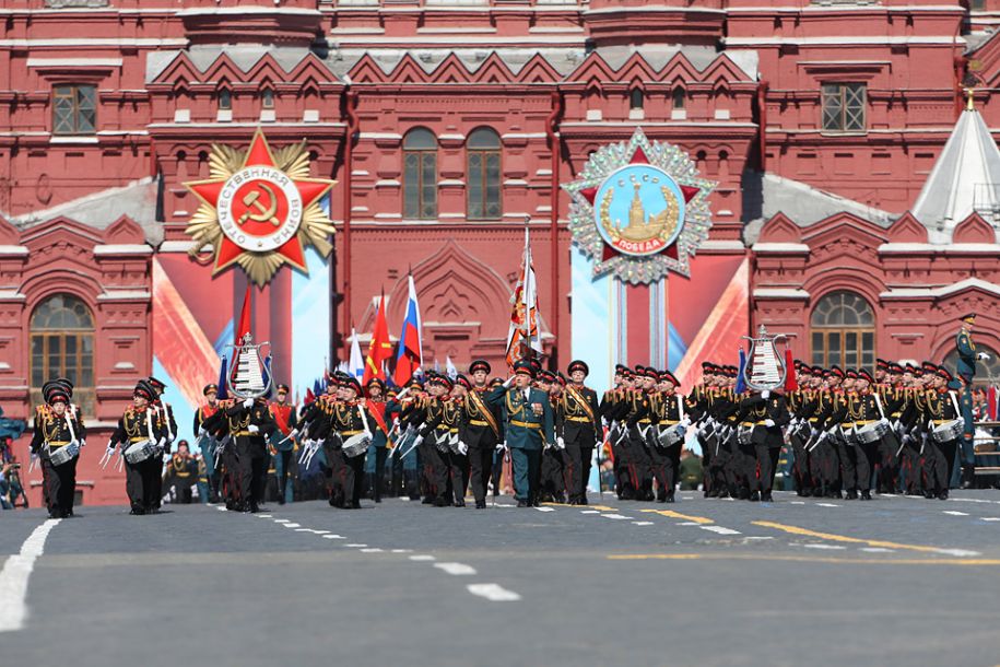 5月9日,在俄罗斯首都莫斯科,军乐团方阵走过红场。纪念卫国战争胜利71周年阅兵式当天在莫斯科红场上举行。新华社记者白雪骐摄