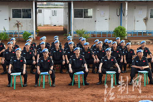 图为中国第四支驻利比里亚维和警察防暴队队员在营地操场观看演讲比赛