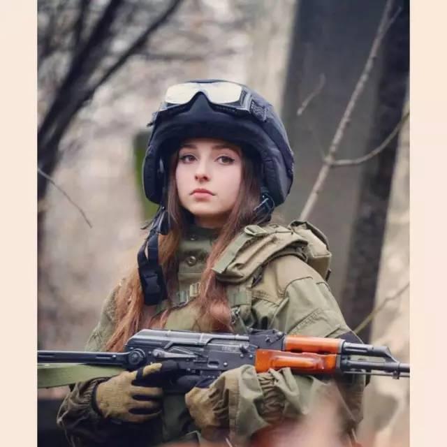 她的身材非常娇小,这样是很标准的俄军士兵握持AK步枪的姿势。