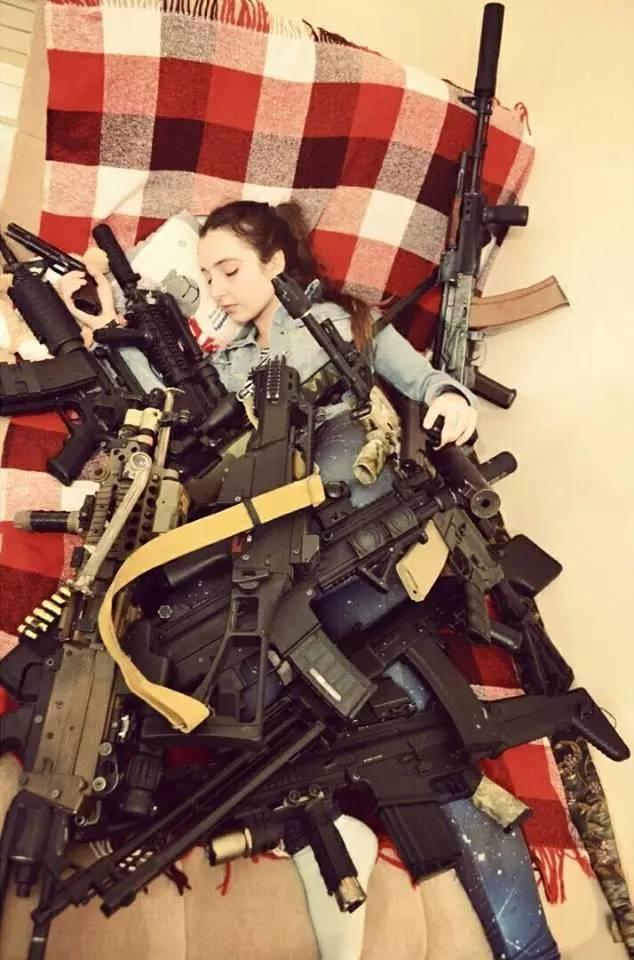 睡在枪堆里的俄罗斯美女军迷