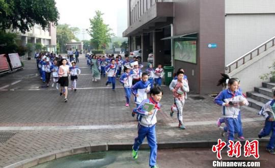 成都世纪城南路学校演习现场师生有序疏散。周迪迪 摄