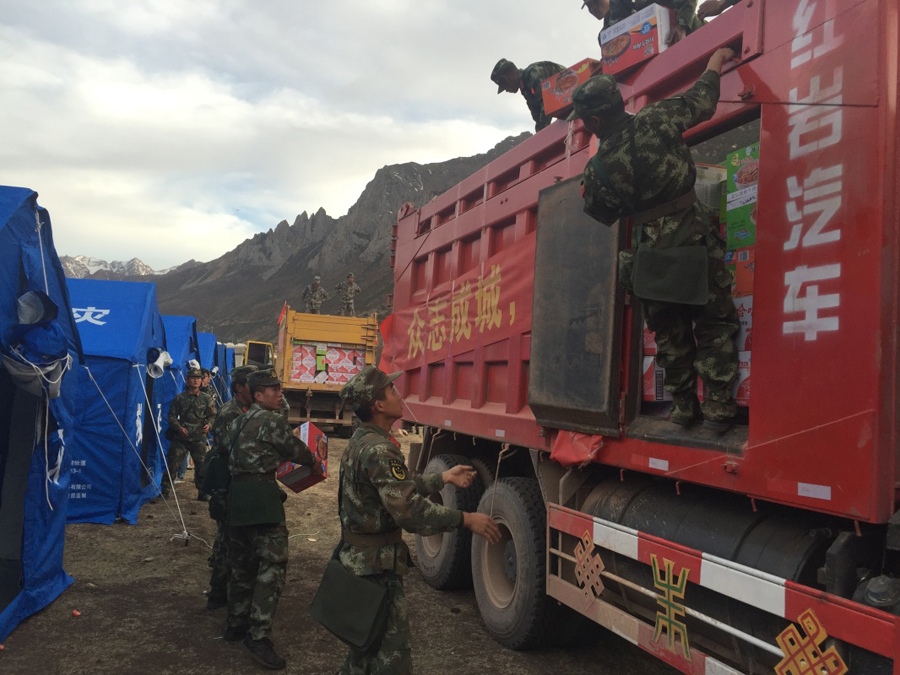 当日,武警西藏总队昌都市支队丁青县中队先遣救援队的官兵在重灾区丁青县嘎塔乡果东村搬运救灾物资,搭建救灾帐篷100余顶。5月11日9时15分,西藏昌都市丁青县发生5.5级地震,已造成震中嘎塔乡60多名村民受伤,其中6人伤势较重。