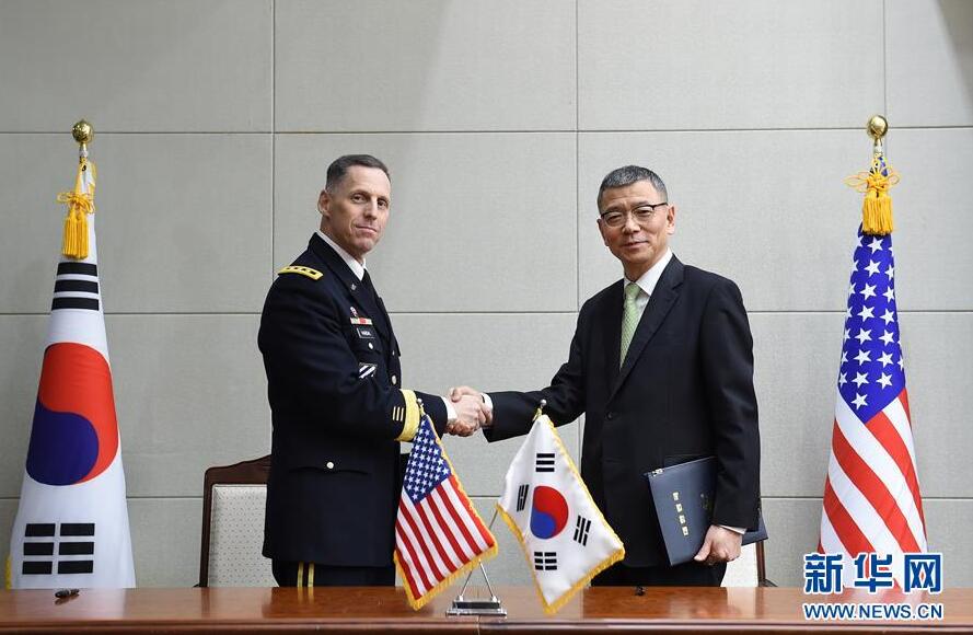 资料图:2016年3月4日,在韩国首尔,韩国国防部国防政策室室长柳济昇(右)和美国陆军第八集团军司令托马斯·范达尔签署协议后握手。韩国国防部4日说,韩国和美国当天签署了就部署“萨德”反导系统筹建联合工作组的协议。 新华社/纽西斯通讯社