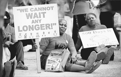 2014年4月,极端组织“博科圣地”在尼日利亚奇布克镇的一所学校绑架200多名女学生。这些女学生至今下落不明。图为日前被“博科圣地”绑架的女孩家属在阿布贾组织集会,纪念该事件发生两周年。