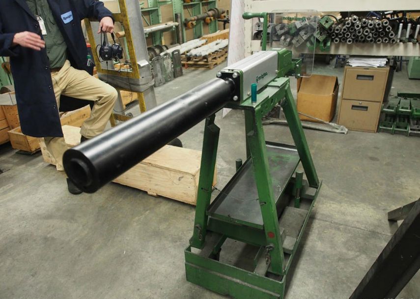猜猜这是什么?这是雷明顿公司自制的霰弹试验枪,很多公司也会购买这样的检测设备,售价高达数万美元。注意后面的可替换枪管和枪闩。
