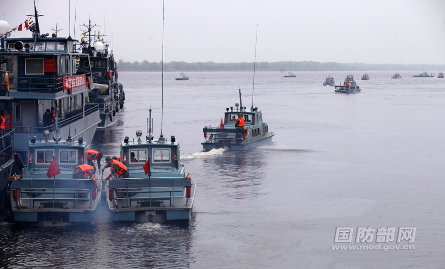 黑龙江省军区某边防巡逻艇大队百余艘船艇编队正式下水试航