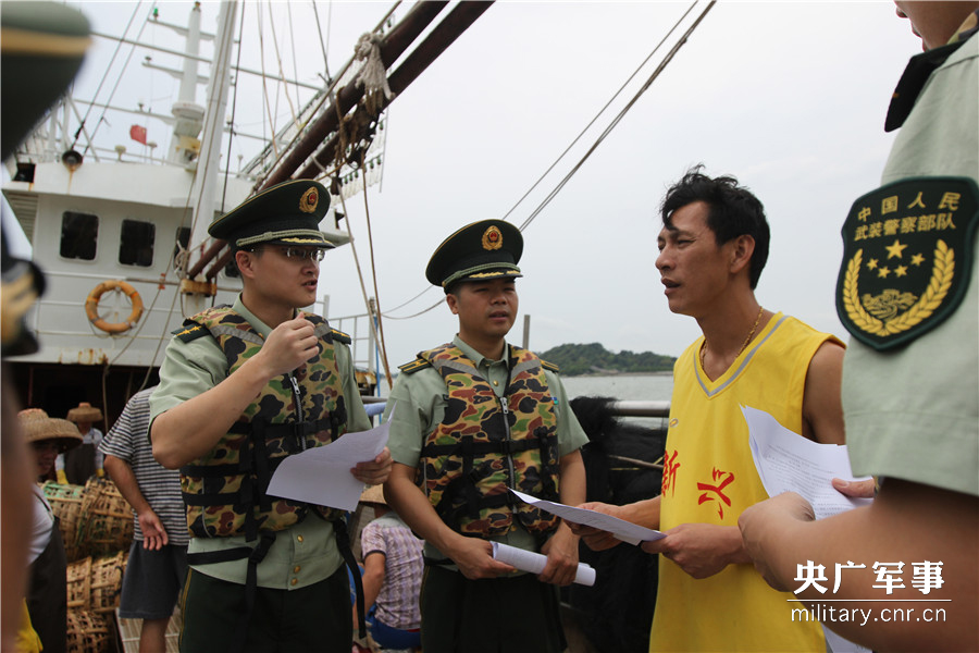 图为广东汕头边防官兵在向渔民进行休渔普法宣传。刘建高 摄
