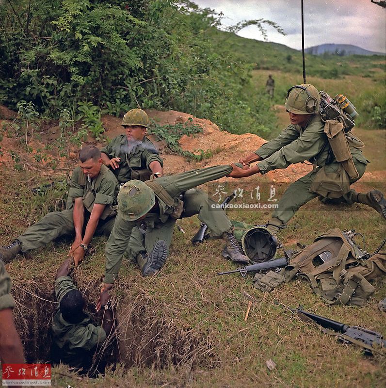 有时遇到紧急情况时,其他部队也会“客串”地鼠部队的任务。 图为1967年4月,隶属于美陆军第一空中骑兵师的侦察排士兵,正准备探察一个越军地道入口。