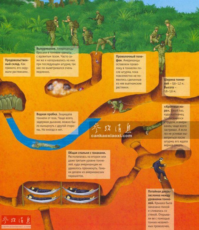 从这张剖面示意图可看出,地道除采用多层多入口设计外,还设置了各种暗门和陷阱,甚至有的地下仓库外,还设有“水道陷阱”,可将误入的美军“地鼠”淹死。