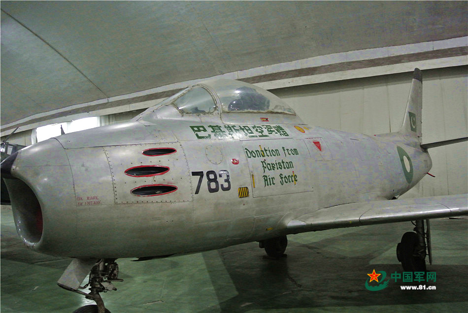 F-86战斗机,是第二次世界大战后美国设计的第一代喷气式战斗机,用于空战,拦截与轰炸。1951年9月25日,中国人民志愿军空军某师飞行员刘涌新在空战中第一次击落该机。放在博物馆的这架是巴基斯坦空军1993年8月8日赠送的。