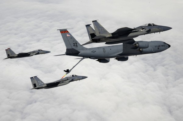 资料图:驻日嘉手纳基地的美国空军第909空中加油中队KC-135加油机,正在为第44战斗机中队的F-15C鹰式战机群空中加油。