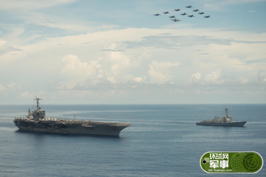 美军航母舰载机进行编队飞行训练