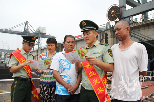 图为王普(右二)带领战士深入驻地宣传无偿献血知识