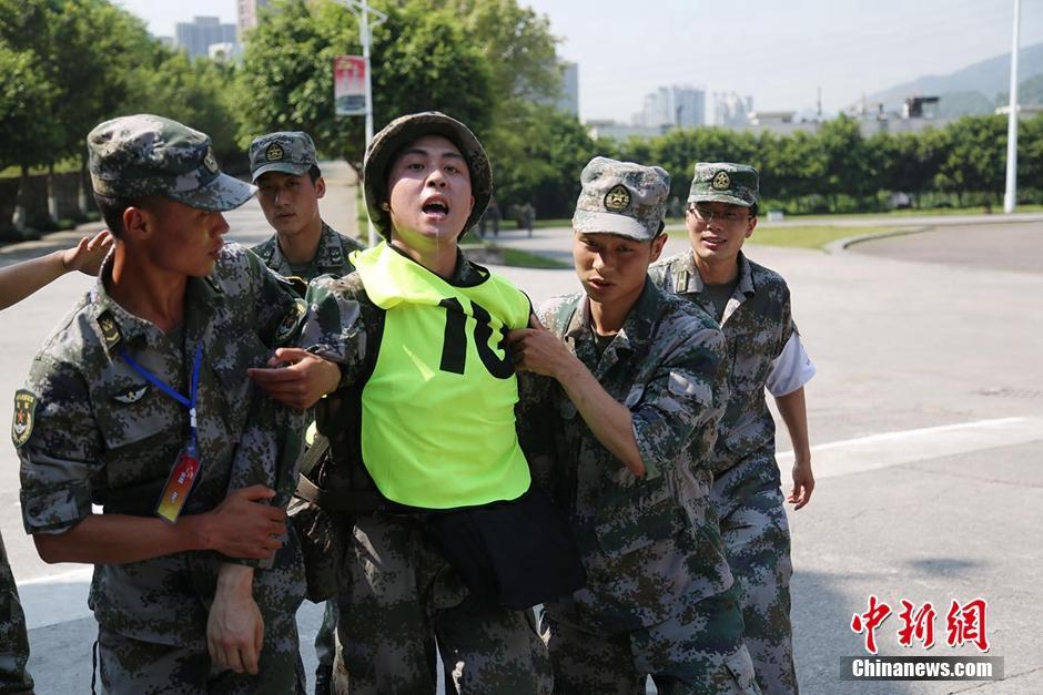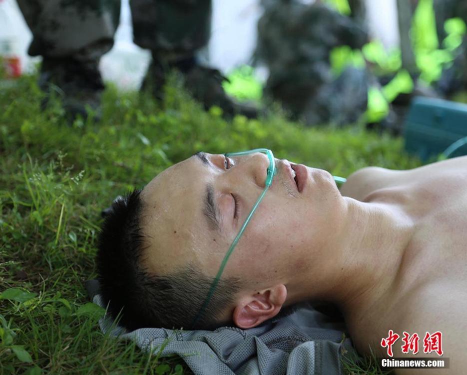 战场就是一场极限的比拼,该同志见到武装五公里越野优异成绩后幸福的倒下,接受输氧(彭佳政 摄)