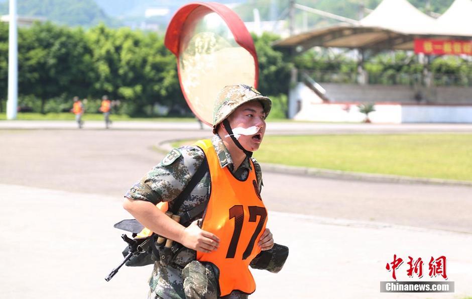 五公里武装越野跑下来,体能达到极限,成绩还是那么优秀,(彭佳政 摄)