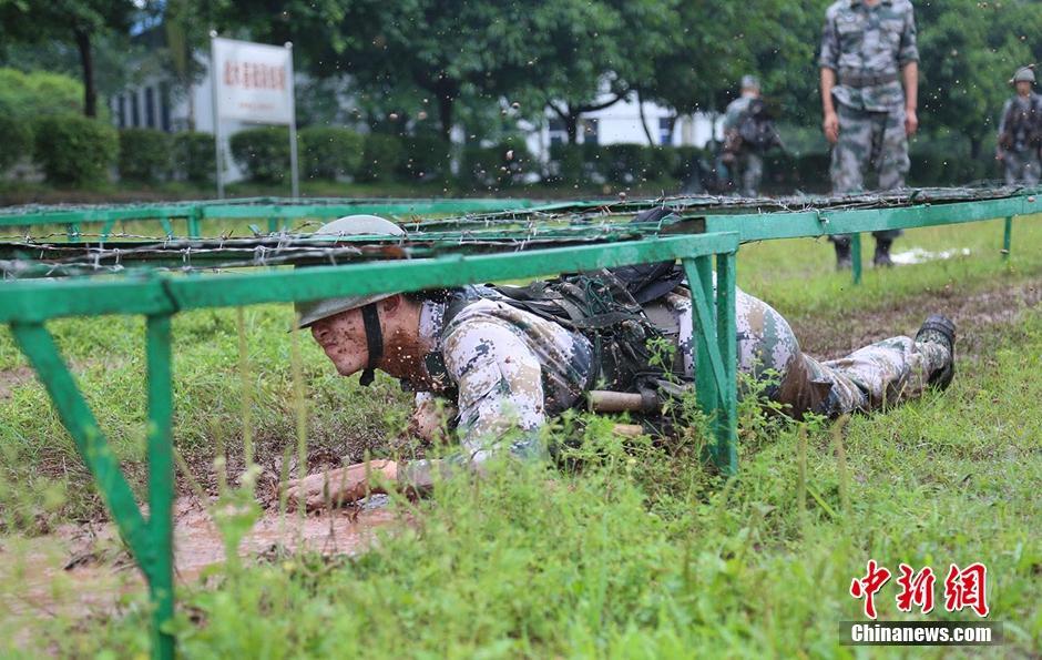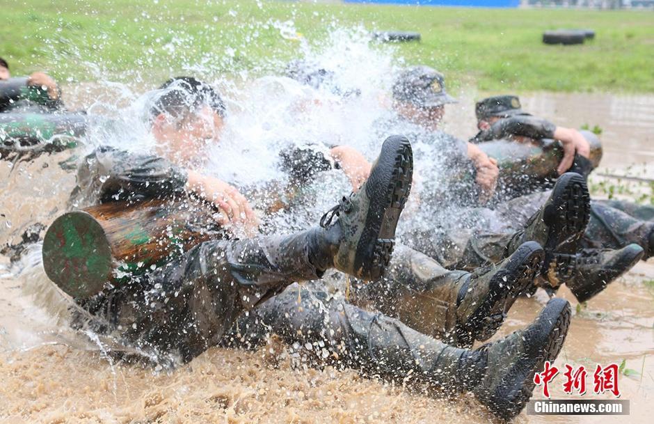 酷暑高温,暴雨袭来,为匍匐训练带来不少难度(彭佳政 摄)