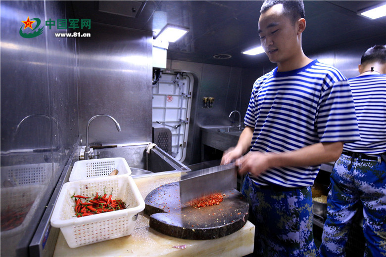 音乐不是厨房的唯一,合肥舰的炊事班其实还自带着一套以班长詹万维为首的合唱班底,时不时来上一首有锅碗铲勺伴奏的小合唱,其振奋人心的作用更胜过小音箱。