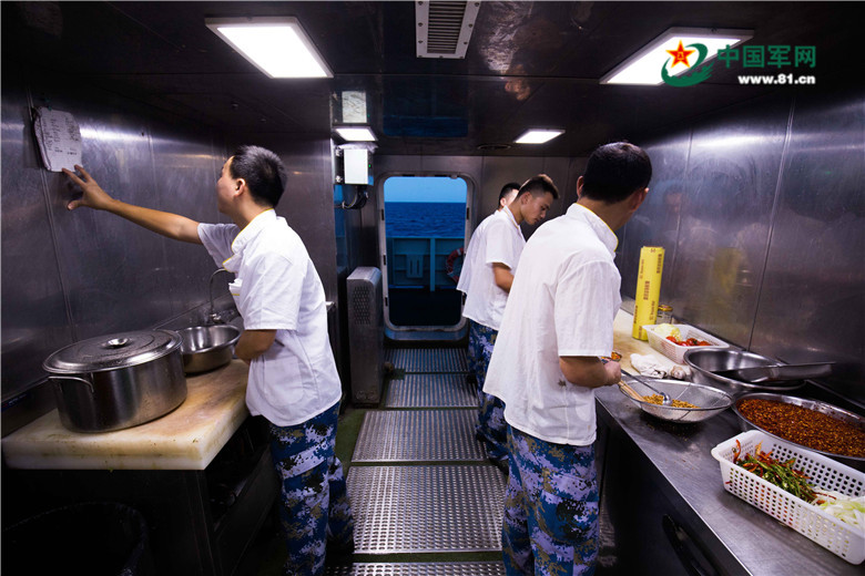 之所以打开厨房的舱门让音乐冲出来,倒不是为了欣赏海景,至少开饭前完全顾不上,而是炊事班的同志们实在太喜欢开着门做饭了。