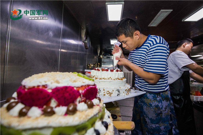 合肥舰5月20日给舰员过集体生日,而这天刚好是中士罗瑞岭的生日,他这个寿星兼厨师亲手给自己也给大家做了两个大大的蛋糕。