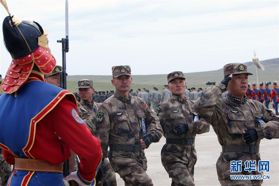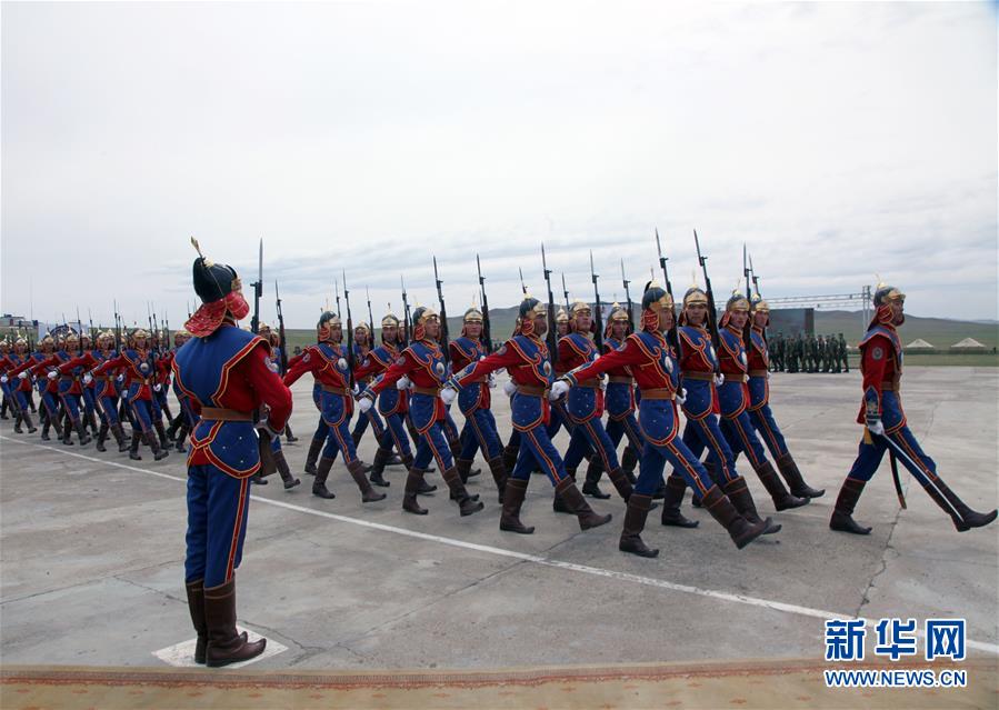 5月22日,在蒙古国首都乌兰巴托以西65公里处的蒙军综合训练中心,中国参演部队接受检阅。新华社记者郑闯摄