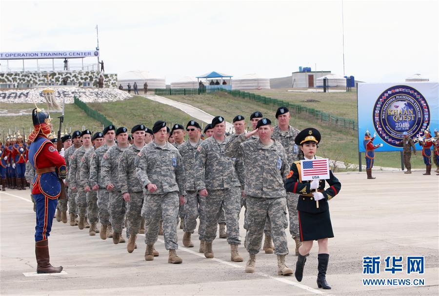 5月22日,在蒙古国首都乌兰巴托以西65公里处的蒙军综合训练中心,美国参演部队接受检阅。新华社记者郑闯摄
