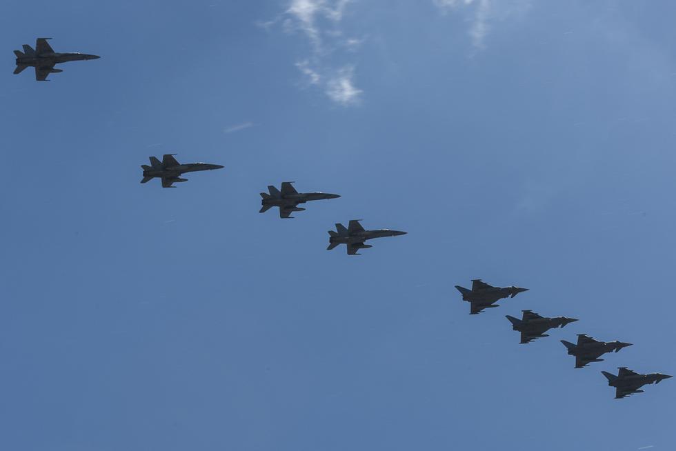FA-18大黄蜂战斗机与台风战斗机混合编队。
